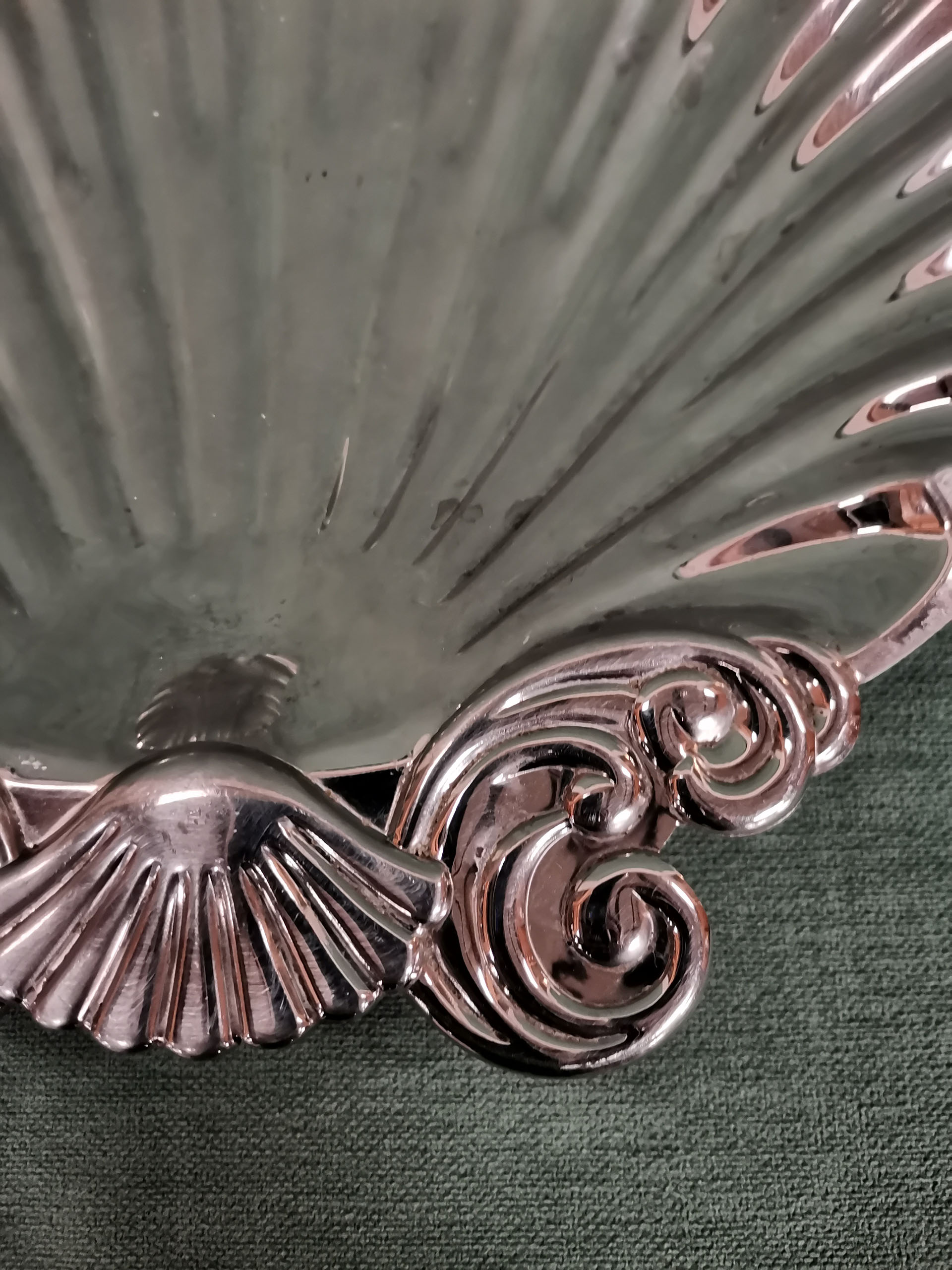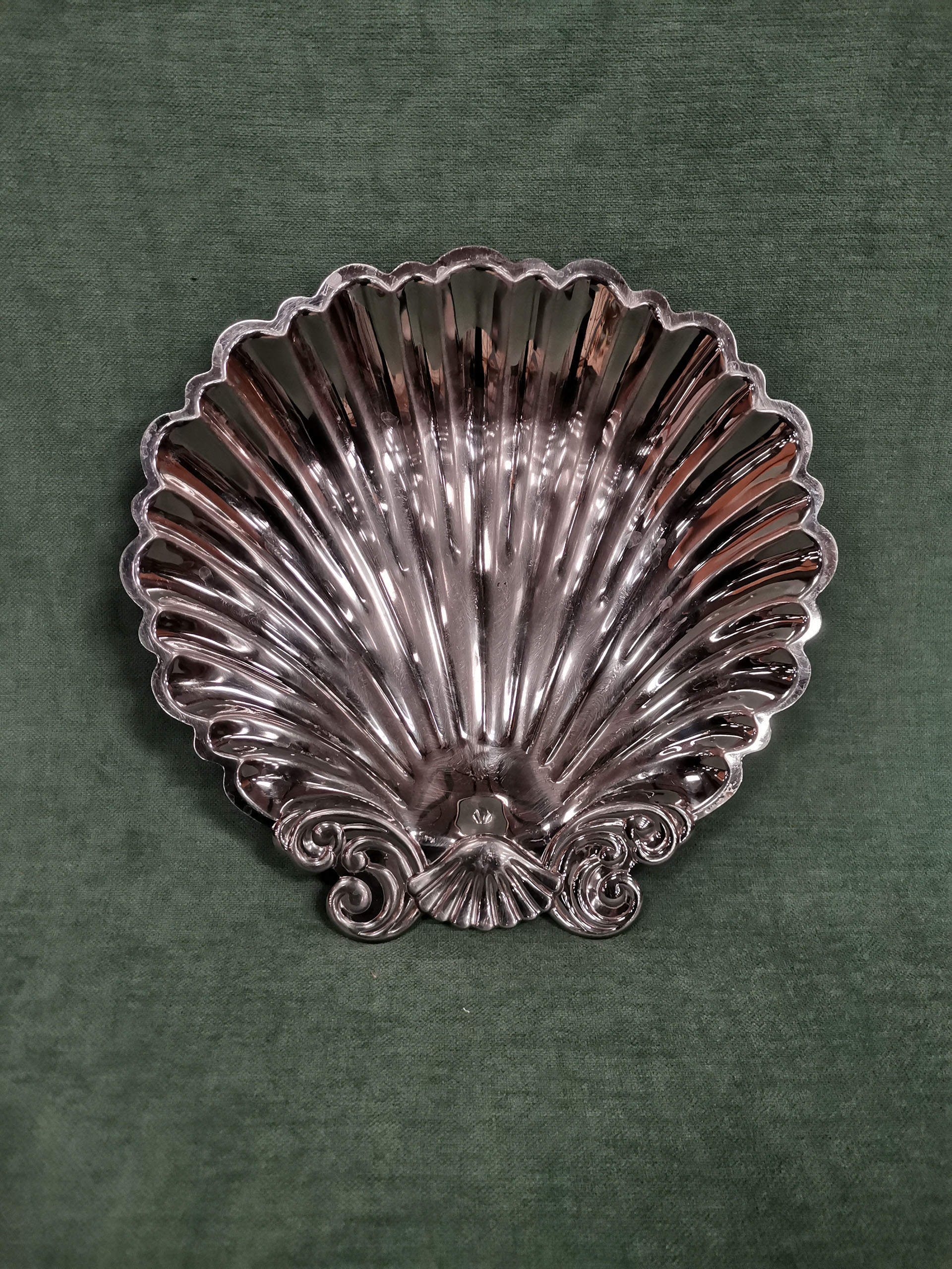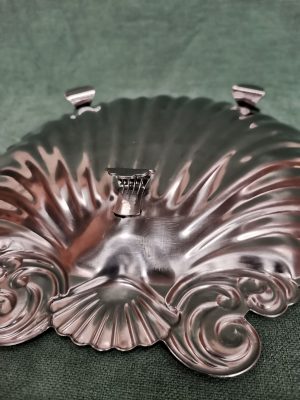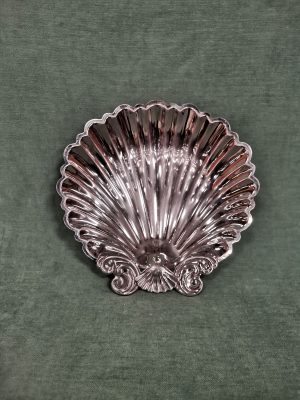 Vide poche en métal chromé en forme de coquille Saint-Jacques pouvant être utilisé comme plat de présentation ou centre de table. Ces trois pieds travaillés lui permettent de ne pas être en contact avec la table.