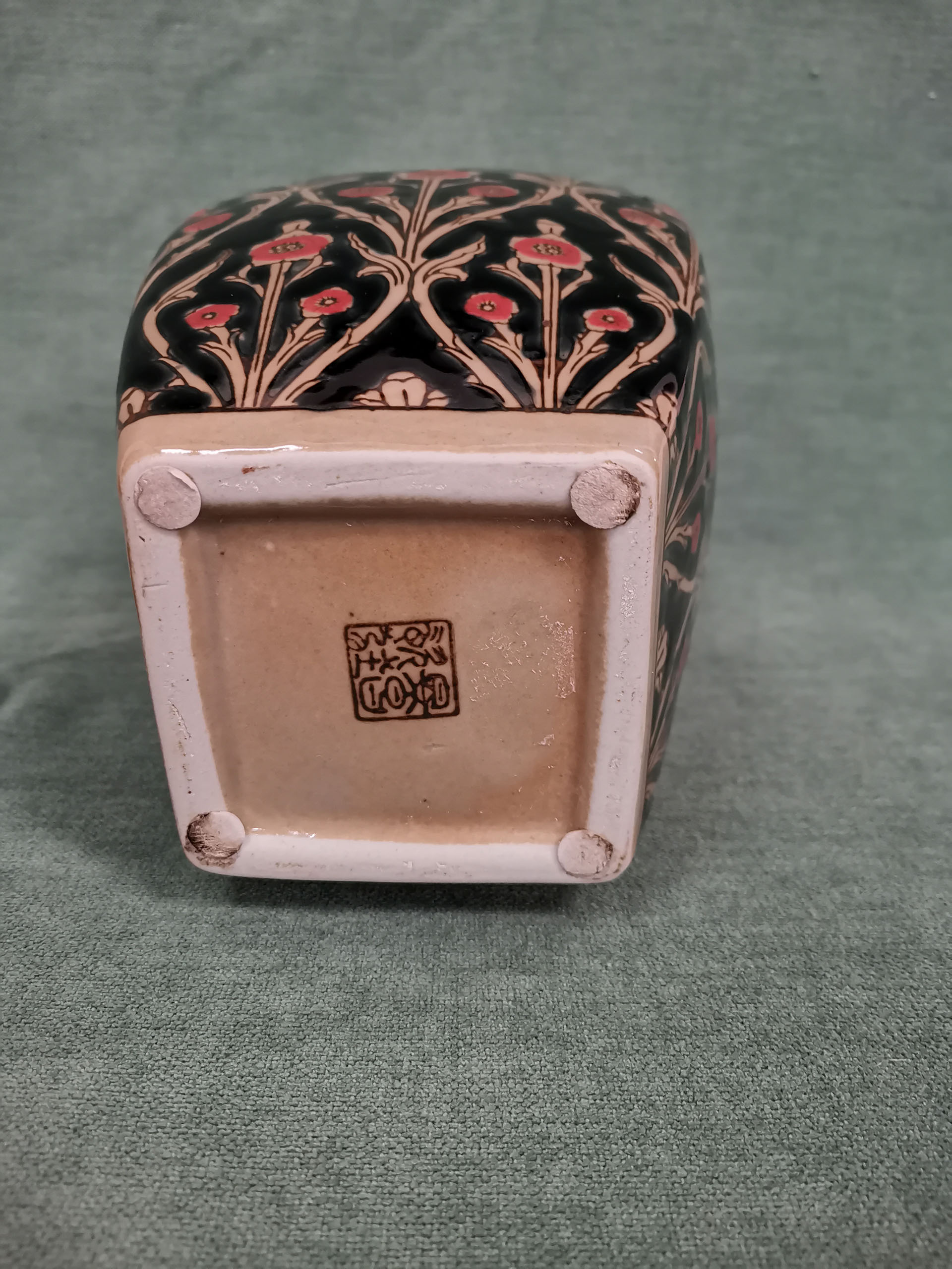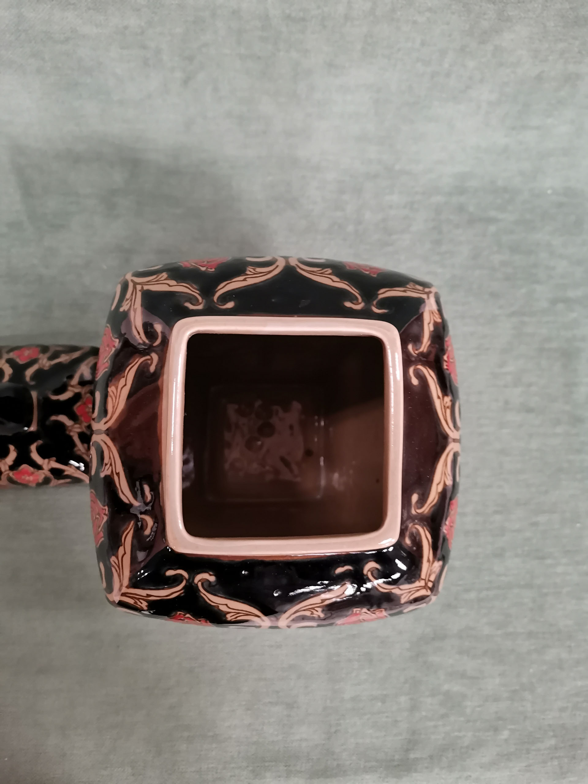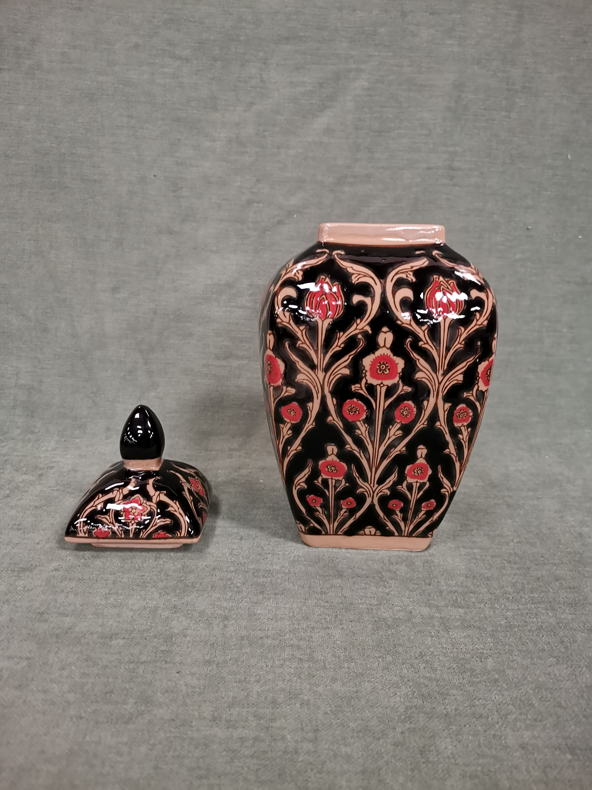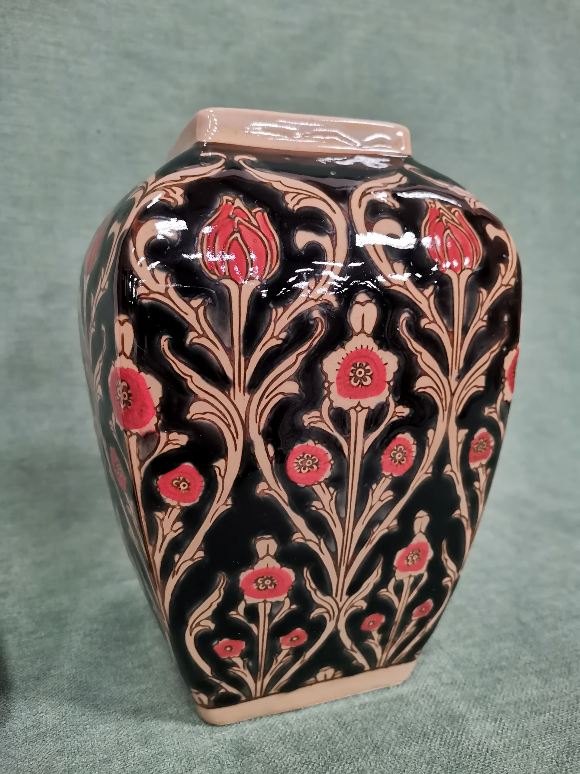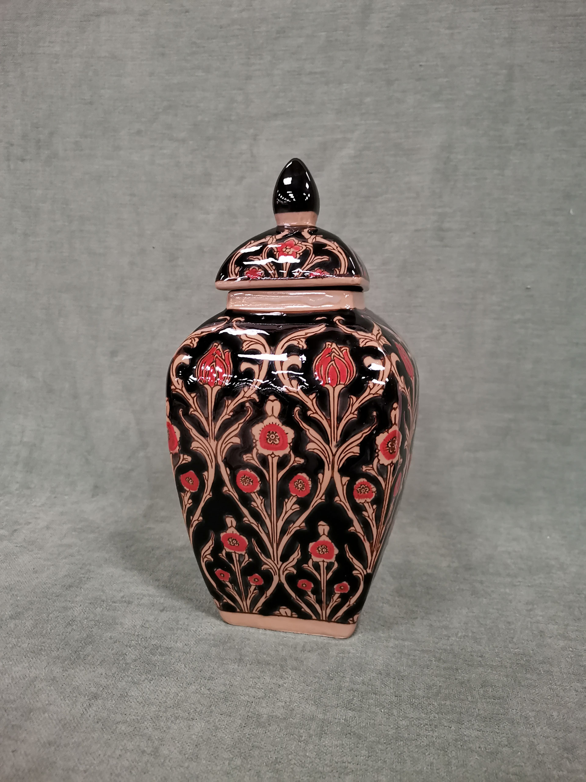 Magnifique pot à gingembre de belle hauteur en faïence. Sur fond noir, il représente des fleurs de pavot rouges.