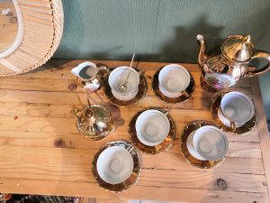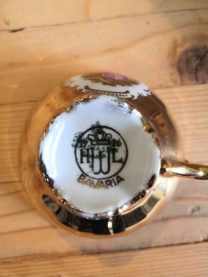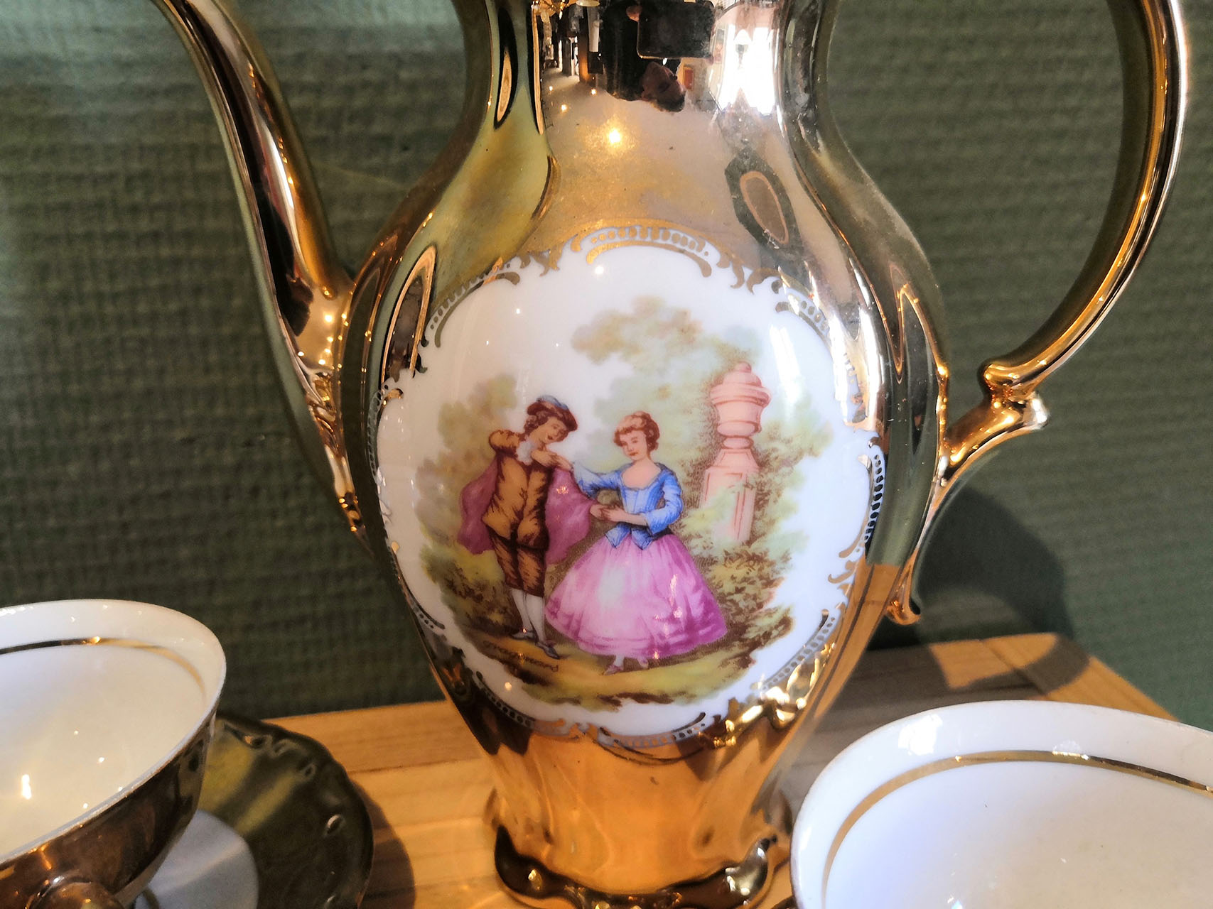 Service à thé bavarois en porcelaine avec un placage en dorure, illustrant un scène romantique et baroque dans un décor bucolique. Porcelaine poinçonnée et signée à l’arrière des tasses. Kitch à souhait.