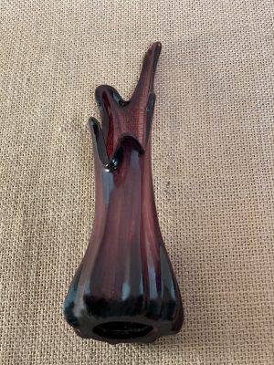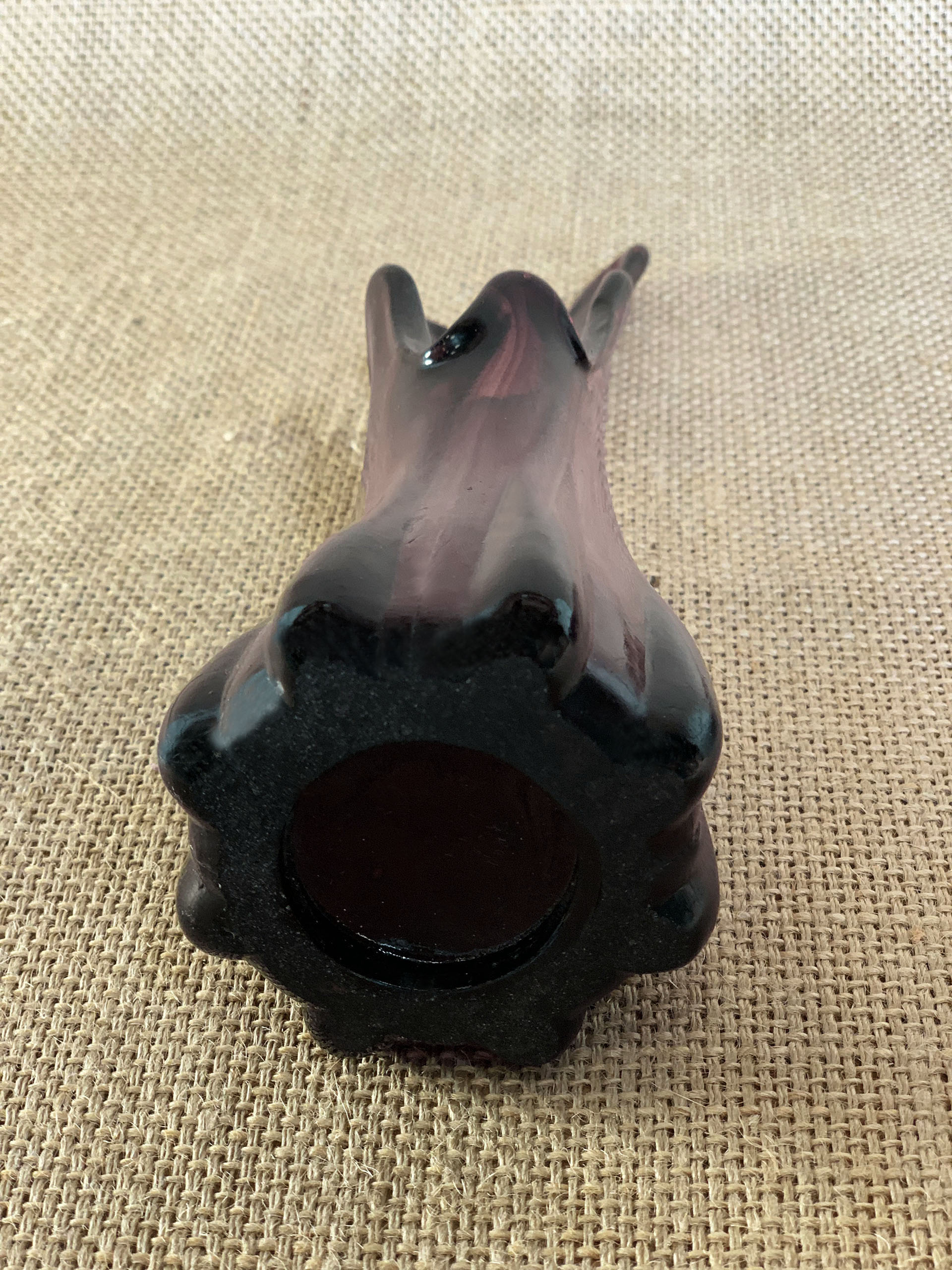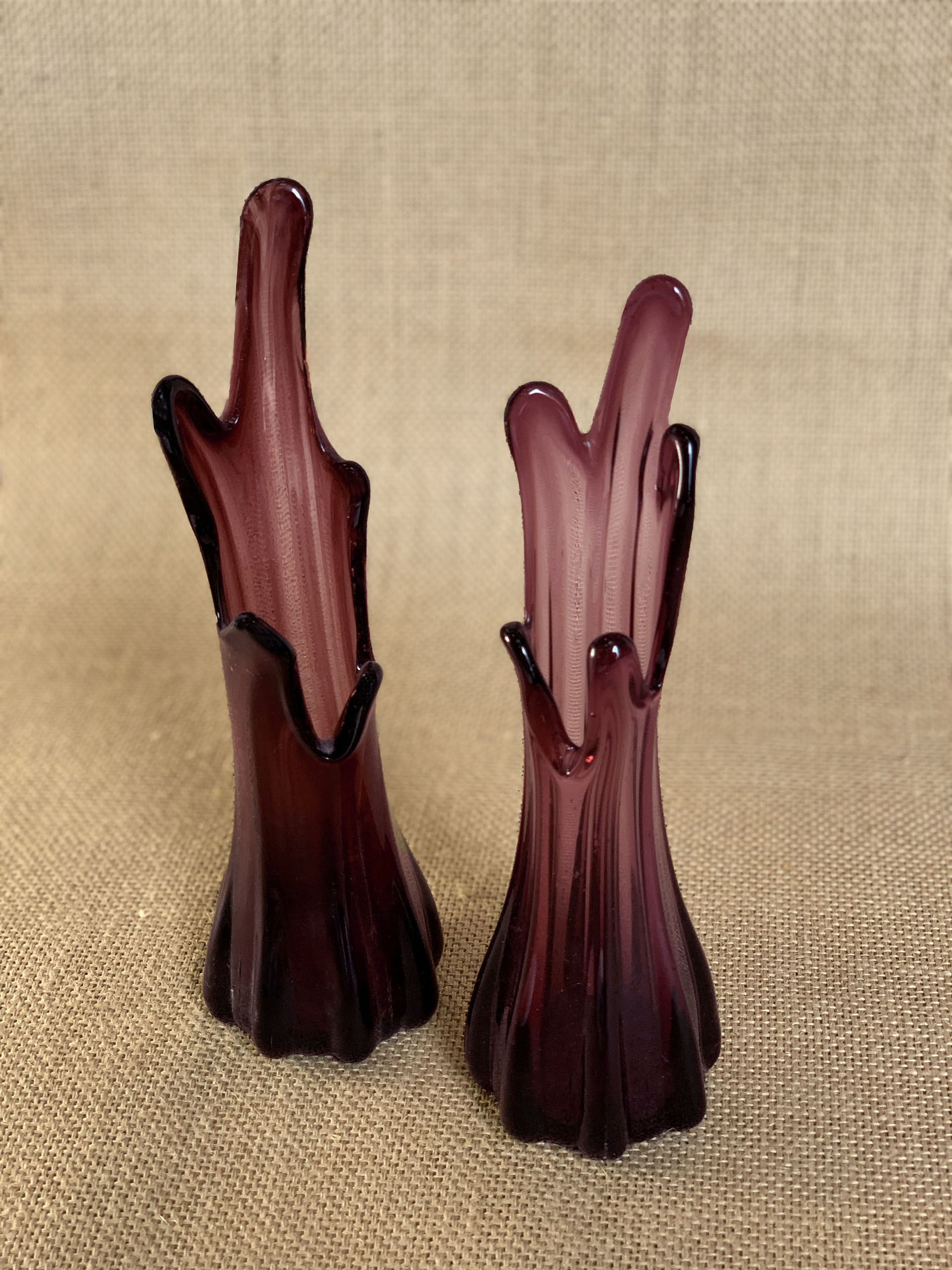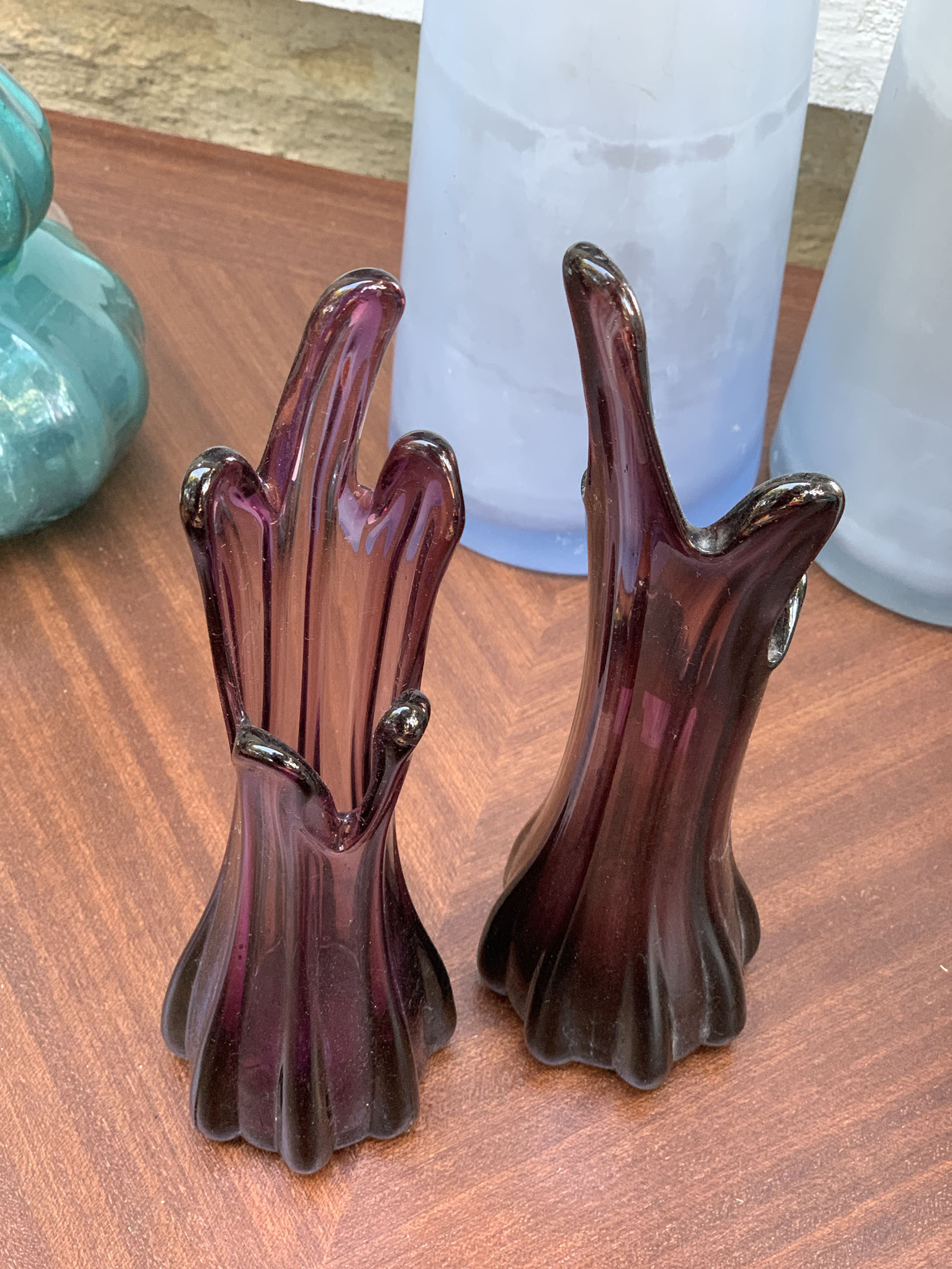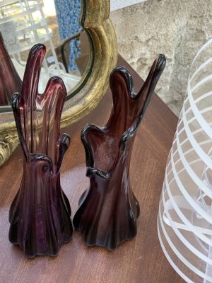 Paire de soliflores de petite taille en verre côtelé pastichant la forme de doigts étirés. Ces vases rappellent le style Murano des années 60. La couleur translucide aux nuances de violet améthyste fait référence aux pierres précieuses portées par les évêques.