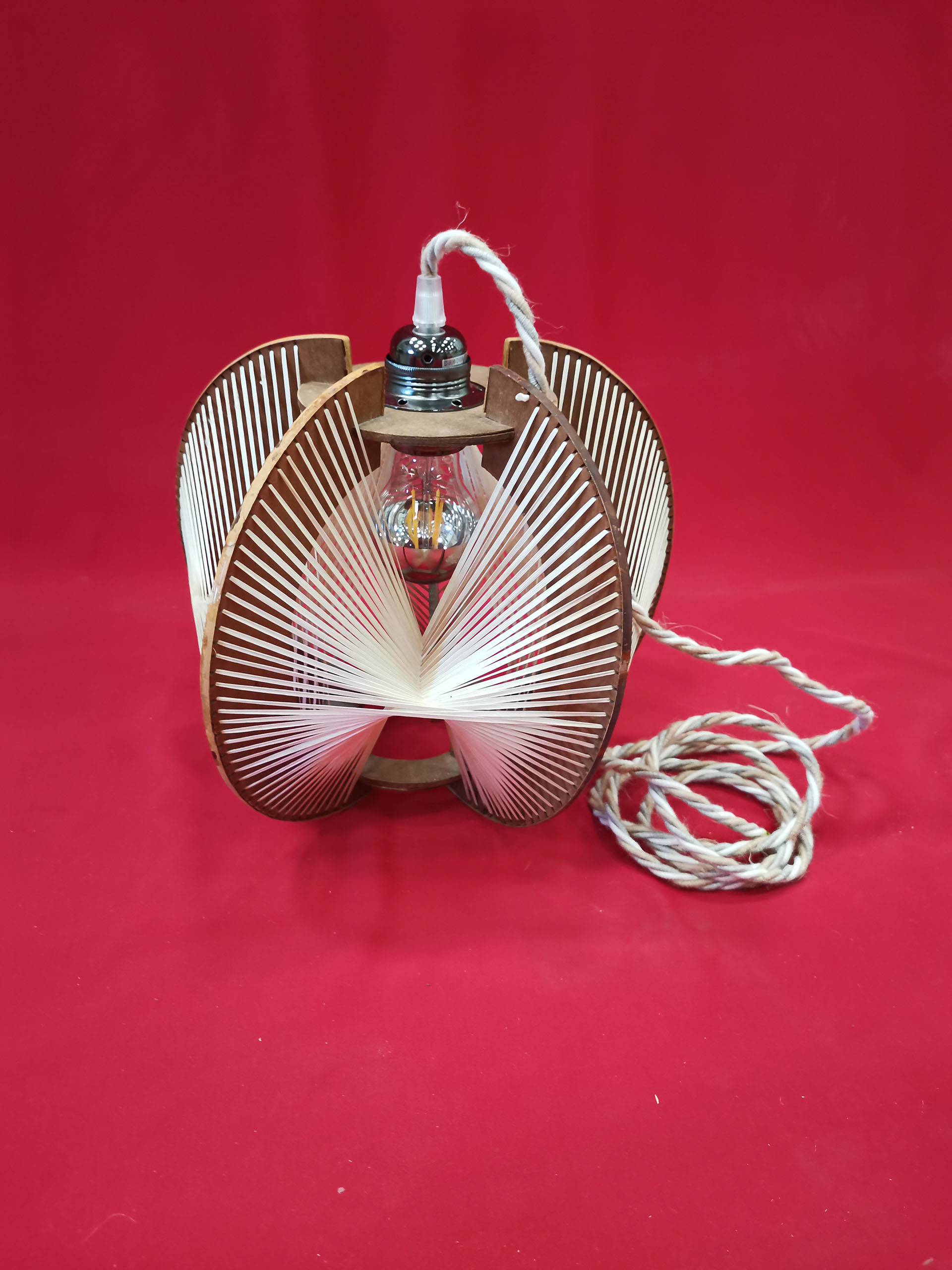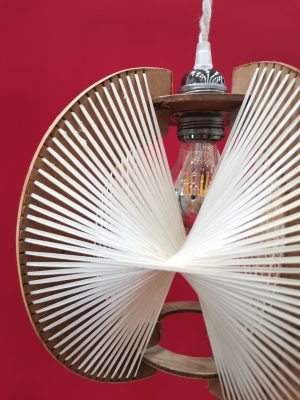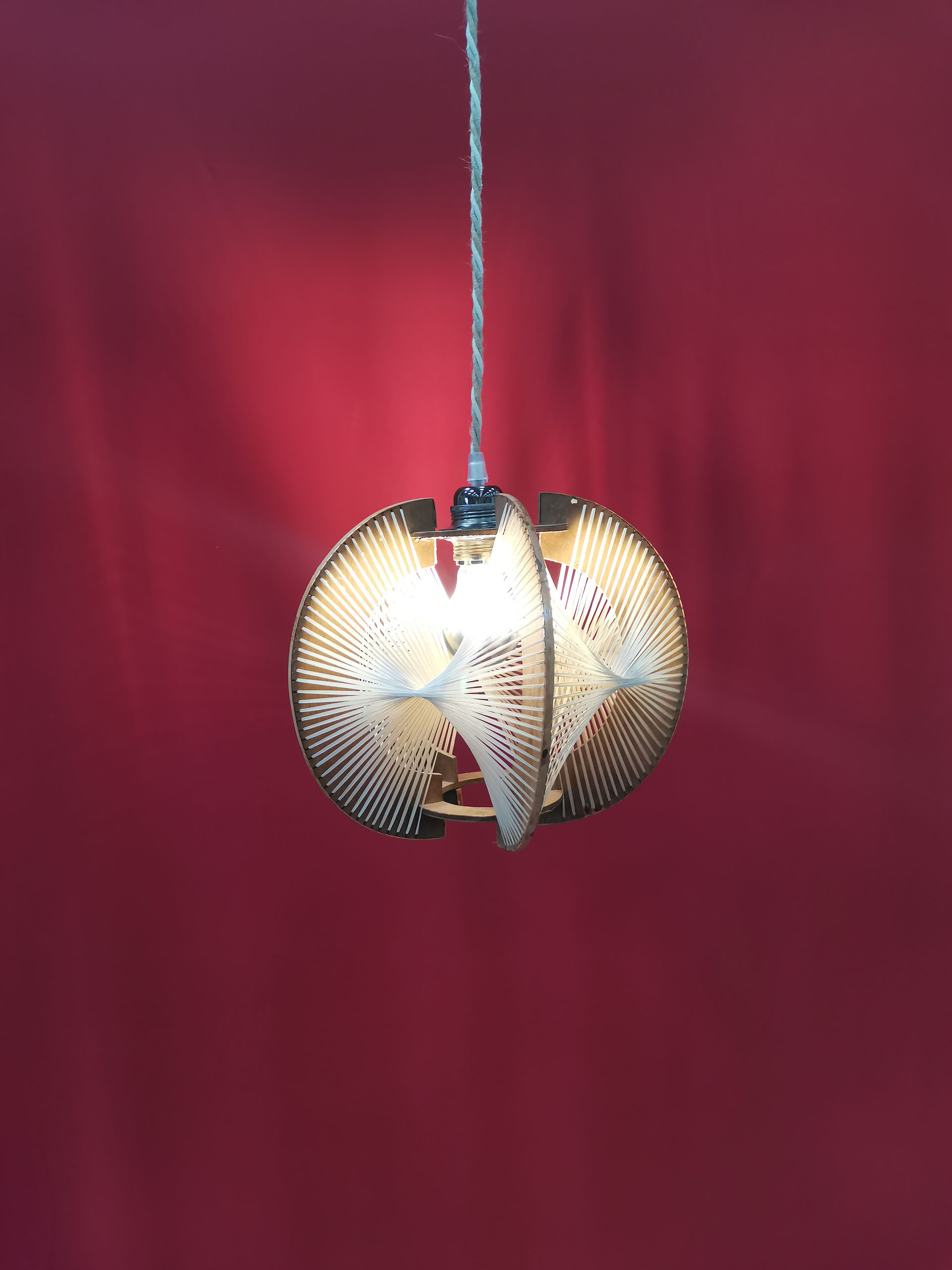 Magnifique lampe baladeuse en bois et en fils de lins tressés extrêmement graphique. La lumière qui en jaillit met en valeur le graphisme de l’objet. Son cordon tressé de fil de coton blanc beige et gris donnera une touche naturelle à votre intérieur. Cette lampe munie d’un interrupteur et d’une prise peut se poser sur un bureau, une table de nuit ou être suspendue. Disque de la base fendu mais qui ne nuit pas à l’esthétisme et à la fonctionnalité de l’objet.
