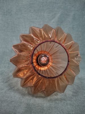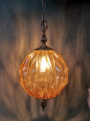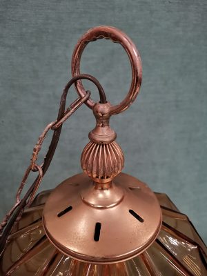 La cloche de verre, jaune orangé, laisse apparaître quelques bulles, signe de l’ancienneté de sa fabrication. La platine, la chaîne et la douille sont dans un laiton légèrement rosé qui donne des nuances mordorées. Les traces d’oxydation ont volontairement été préservées pour lui conserver une certaine patine et tout son charme. La partie inférieure est amovible. En la laissant, le luminaire profite d’une belle symétrie et lui confère l’aspect d’une lanterne. En l’enlevant, le luminaire est plus léger mais plus classique. .. A vous de choisir !