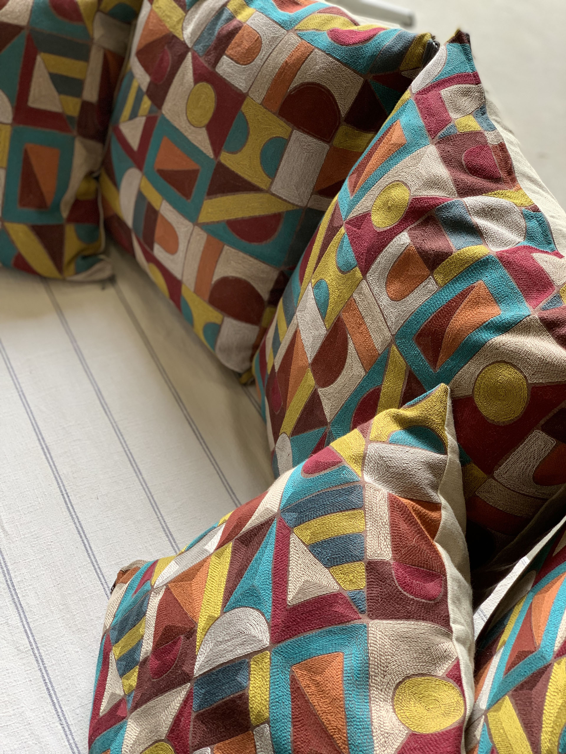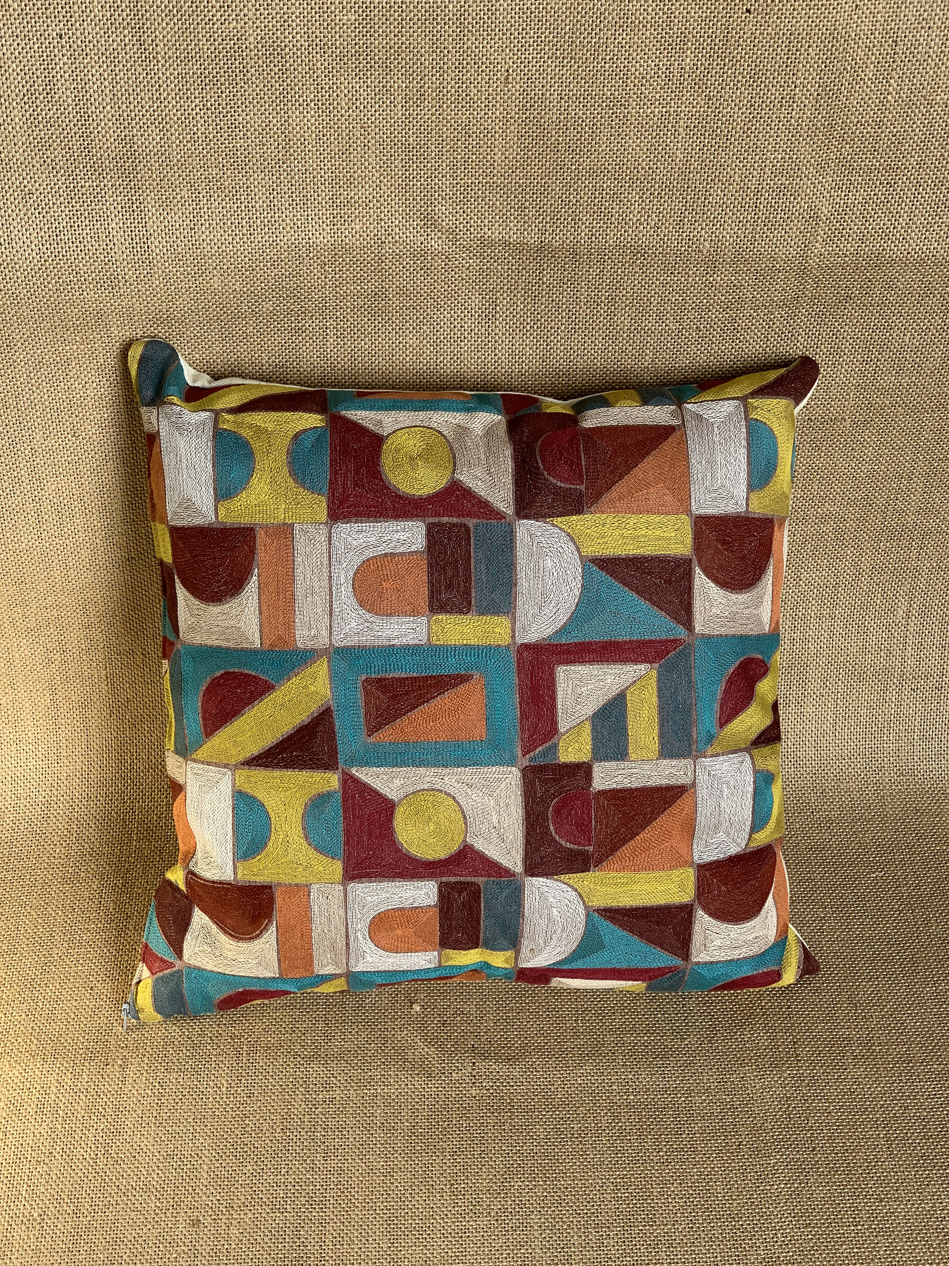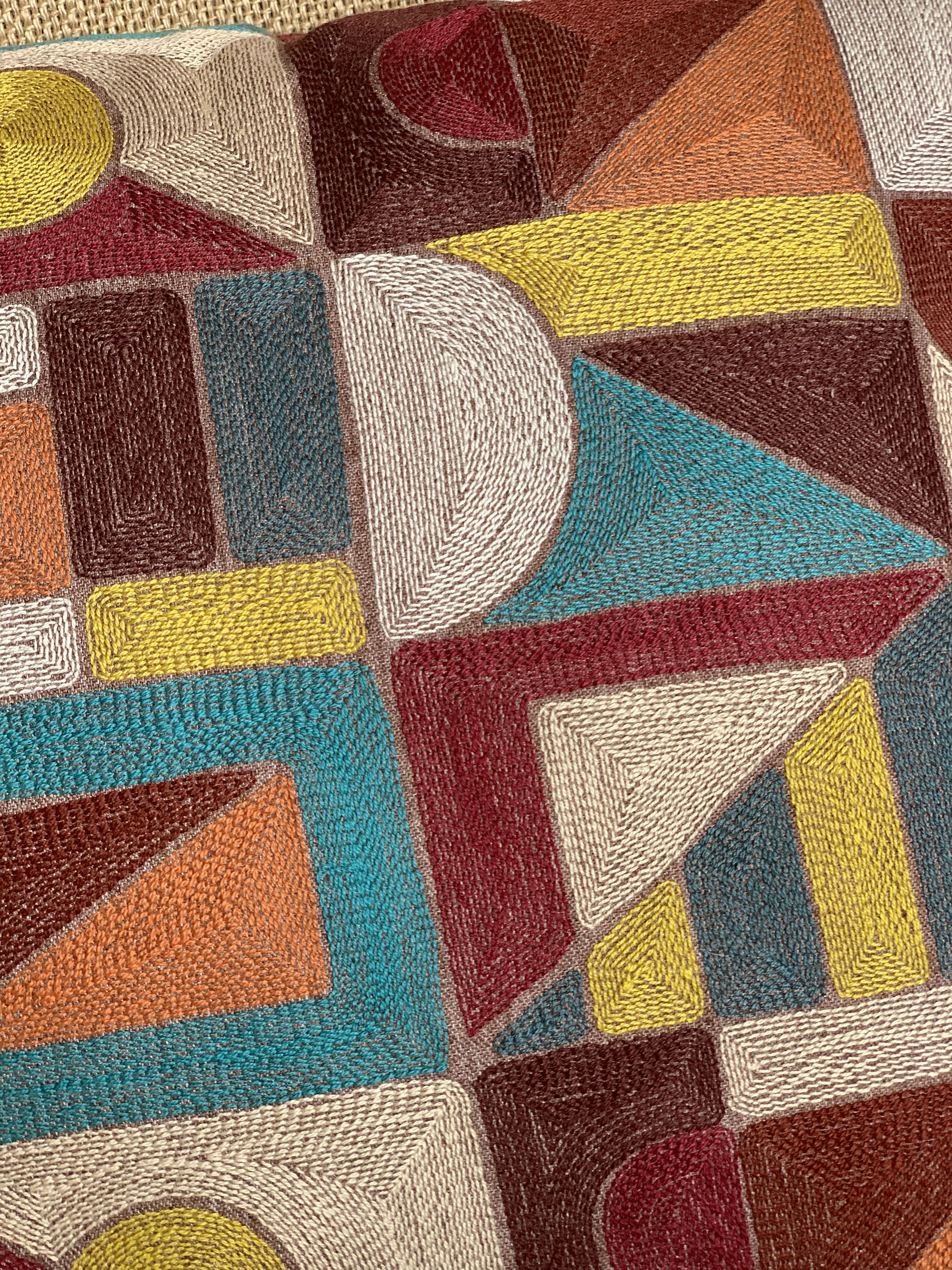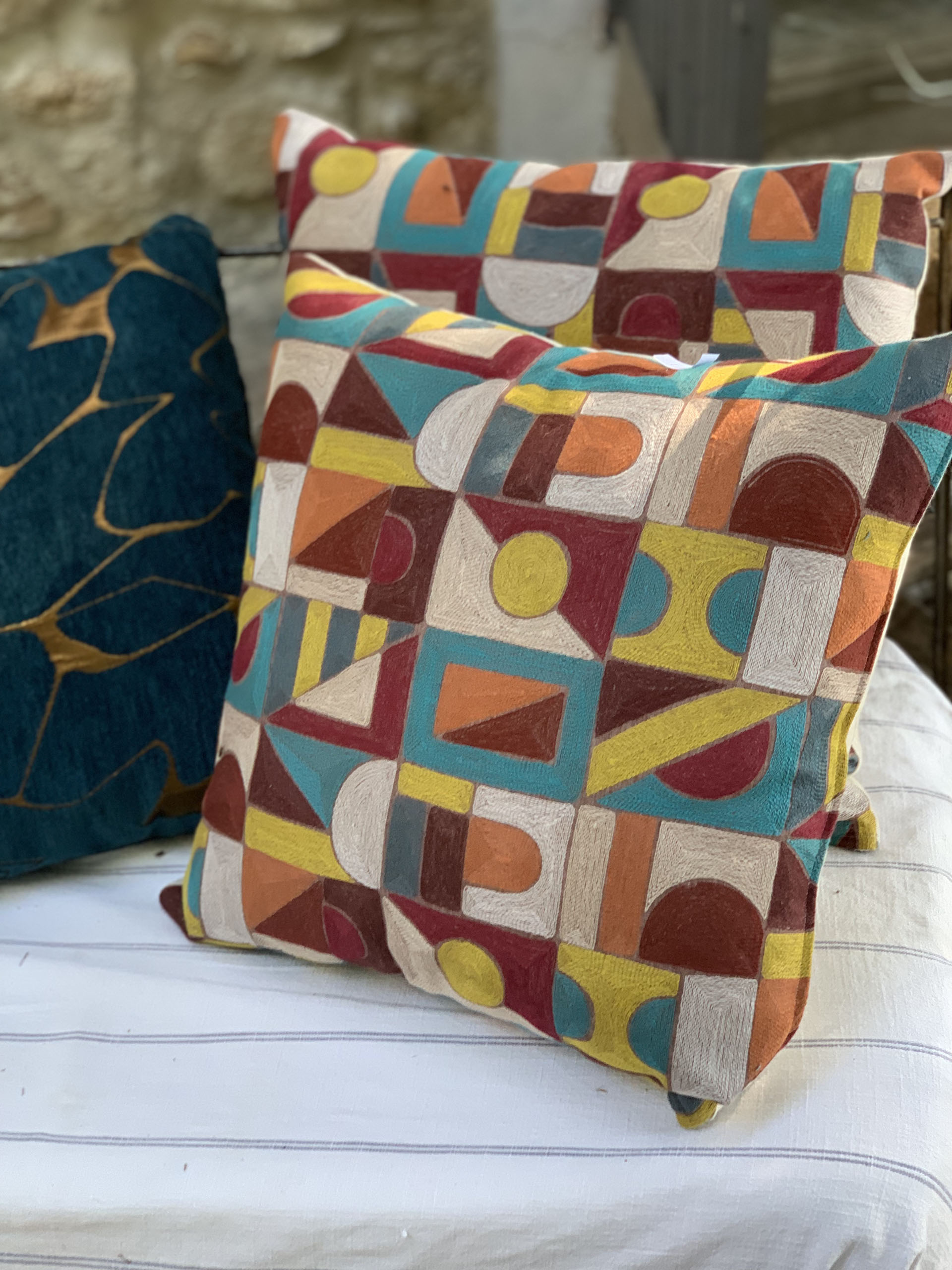 Coussin cousu main en coton brodé de haute qualité, à motif figurant un patchwork de formes géométriques simples abstraites, bi ou tri-colores. Un design moderne de la Maison Thévenon, à forte influence ethnique. Coussin cousu main en coton brodé de haute qualité, à motif figurant un patchwork de formes géométriques simples abstraites. bi ou tri-colore. Un design moderne de la Maison Thévenon, à forte influence ethnique. Dominante de tons chauds et descendus, orange, marron, beige, jaune, bleu cyan, ocre. Verso blanc cassé. Liserés robustes et cousus main. Stylisé, moderne et ludique avec sa palette de couleurs naturelles au ton descendu, le motif d’inspiration ethnique amérindienne chaleureuses et saisissantes, ajoutera du contraste, du dynamisme et de la convivialité à votre intérieur.