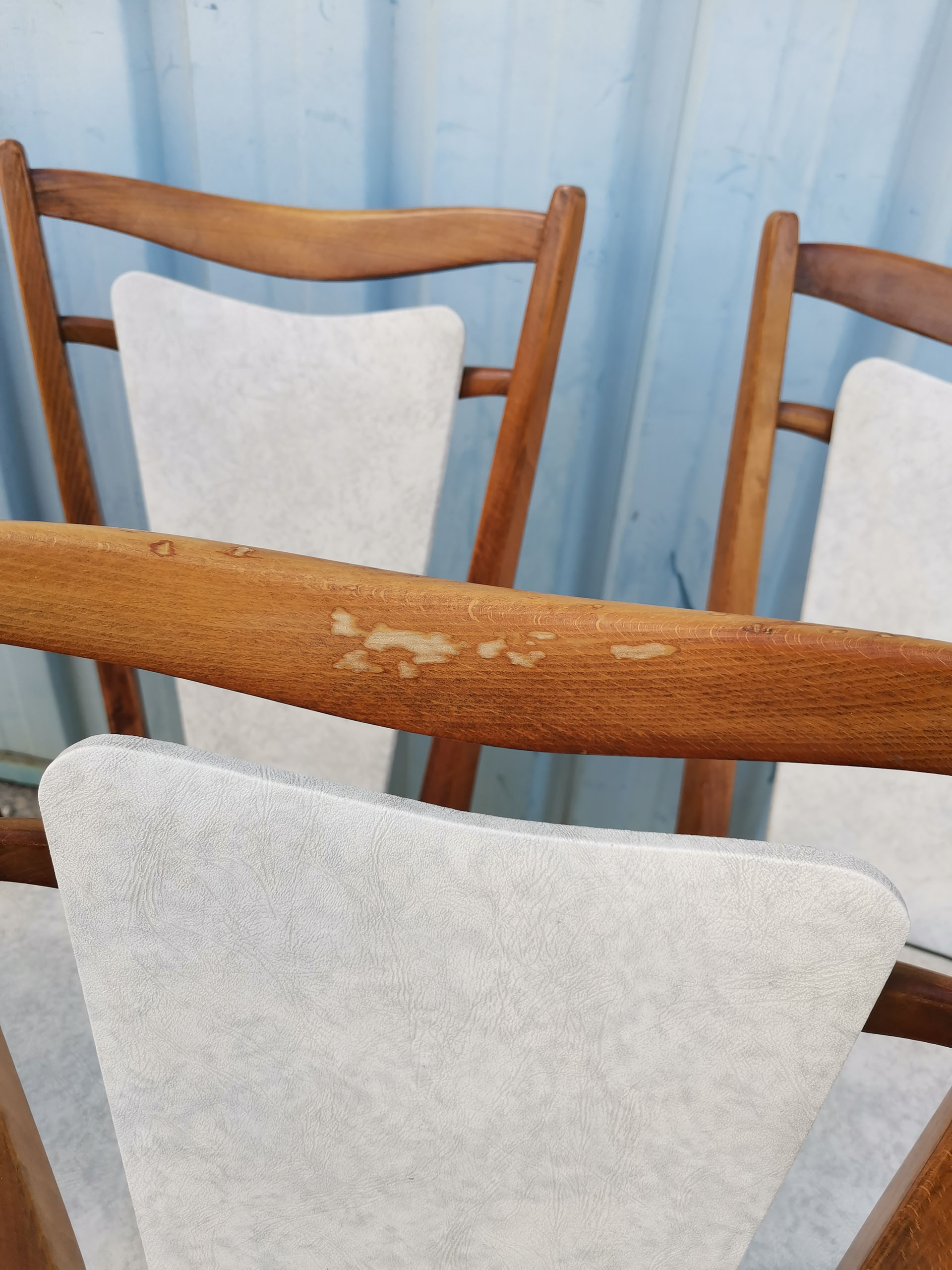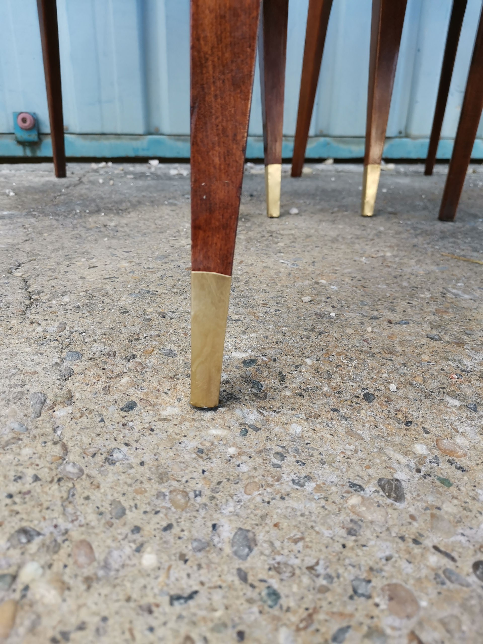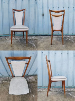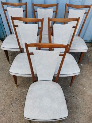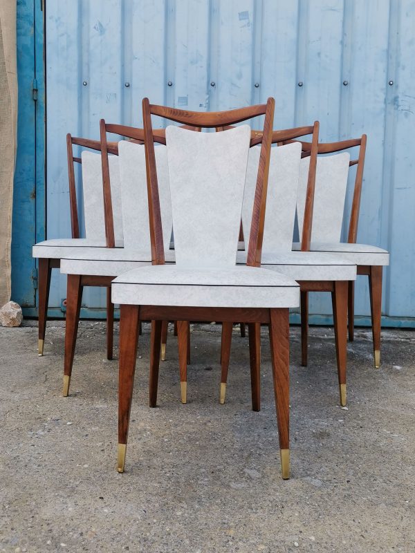 Magnifique lot de 6 chaises au design graphique. Les pieds fuselés, compas ont été laitonnés à leur extrémité. Les dossiers évasés, donnent tout le graphisme à cette ensemble. Les assises ,toutes en excellent état, sont recouvertes d’un simili cuir blanc marbré. Le bois verni, laisse apparaître quelques marques du temps mais sans en altérer l’esthétisme et la fonctionnalité.