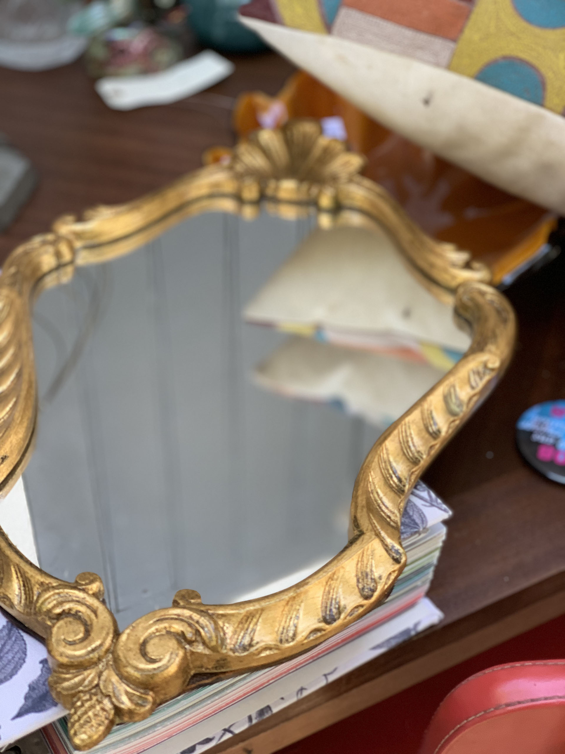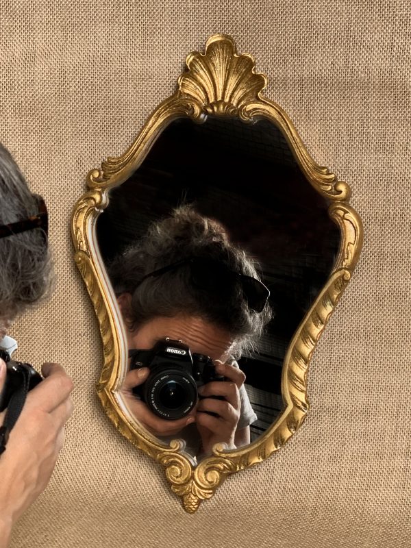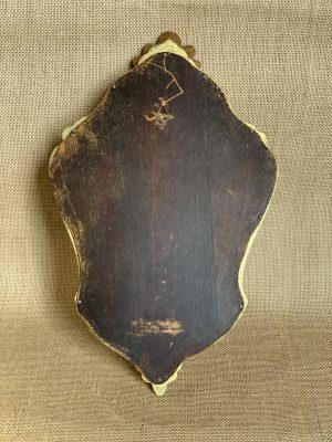 Petit miroir baroque, de forme ovale, décoré d’un joli fronton coquille et d’un cadre tout en arabesques et volutes style louis XV. Très peu de stigmates de sa vie précédente, ce qui fait tout son charme. Pour les amoureux d’objets qui racontent une histoire uniquement. Sa patine, laissée par le temps qui passe, est très belle et lui confère une forme d’élégance. La glace est dotée d’une belle brillance et on ne remarque pas les micro rayures. Le cadre en résine/stuc doré avec fond en bois offre une belle résistance. Malgré son petit format, ce beau miroir aux accents romantiques focalisera toutes les attentions et apportera grâce et élégance sur un mur. Muni de son attache.