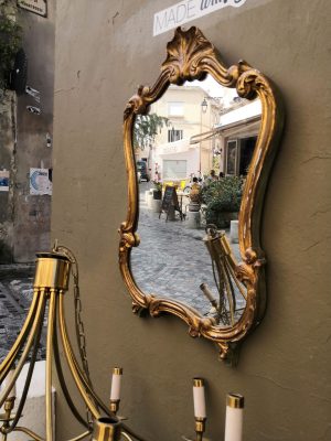 Miroir rocaille en bois doré de style LouisXV avec fronton coquille